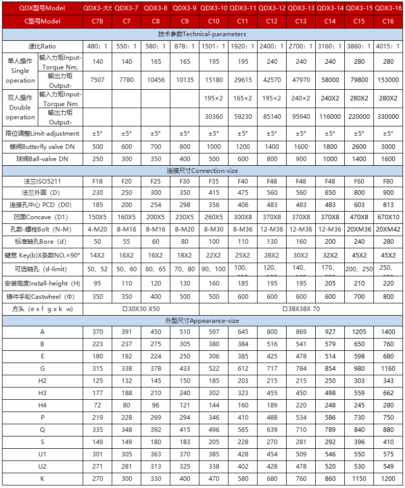 該系列是小蝸輪箱與大蝸輪箱對接組合成為二級傳動蝸輪減速增壓機構,提高了機械總效率,輸入小力矩,開動大閥門,使操作人員省力,每種型號提供多個傳動比,特殊型可輸出360°無限多回轉,能更好的匹配不同規格的閥門。