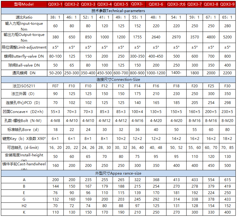 該系列是一款90°部分回轉驅動裝置,適用于球閥、蝶閥、旋塞閥等類型閥門。該系列蝸輪箱適用環境廣、功能全面、形式多樣(有手輪式、手輪帶鎖式、鏈輪式等),特殊型可輸出360°多回轉。產品共有9種型號。